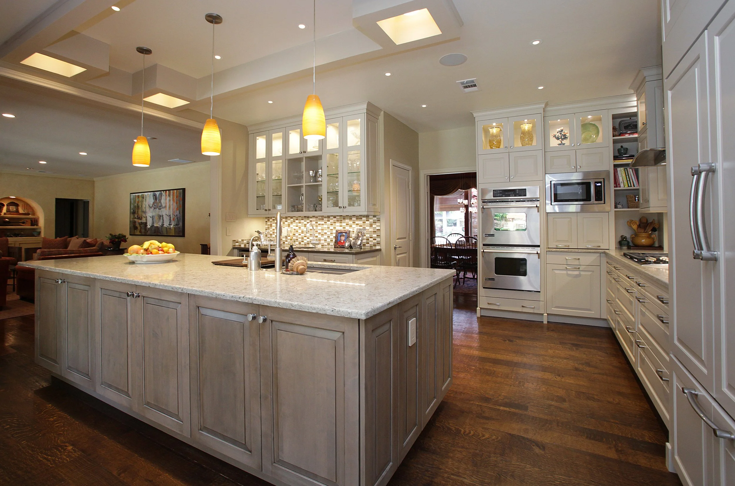 The owners of a fifty year old mid-century modern house wanted a complete rebuild of the kitchen, breakfast room, and powder bath. The original kitchen space was substantially enlarged and opened to the family room. An interior wall separating the kitchen and breakfast room was removed. This allowed natural light into the centrally located kitchen from the large breakfast room windows. The adjacent powder bath was also completely remodeled with new fixtures, finishes, and cabinets.